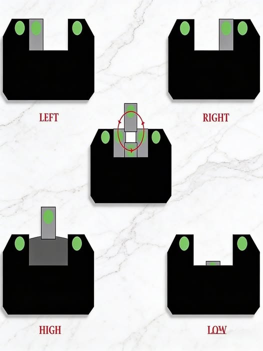 תמונה זו מדגימה יישור נכון של כוונת אקדח וכיצד תמונות כוונות שונות משפיעות על דיוק הירי. יישור נכון: החלק העליון של הכוונת הקדמית צריך להיות בגובה החלק העליון של הכוונת האחורית, עם מרווח שווה משני צידי העמוד הקדמי. חוסר יישור: אם הכוונת הקדמית גבוהה, נמוכה, שמאלה או ימינה מדי, הירייה תחטיא את המטרה בכיוון המתאים. פגיעת המטרה: ויזואליזציה זו משמשת לעתים קרובות במשחקים או באימונים כדי להסביר מדוע יריות אינן פוגעות במרכז.