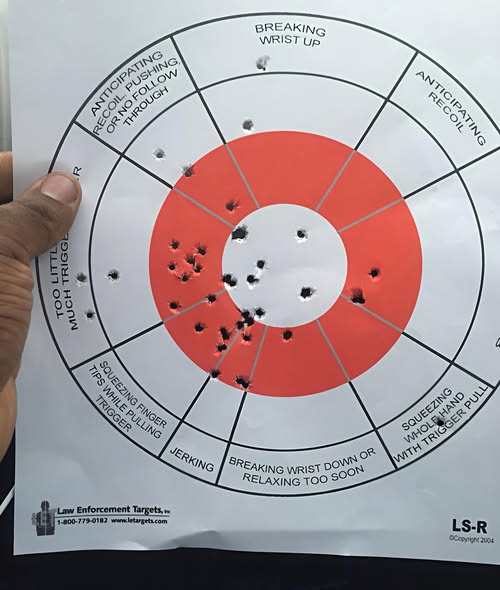 נמוך: יריות הנחיתה נמוך יכולות להצביע על “שבירת פרק כף היד או הרפיה מוקדמת מדי”. זה יכול להיגרם גם על ידי ציפייה לרתע ודחיפת האקדח קדימה או הנמכת הראש.