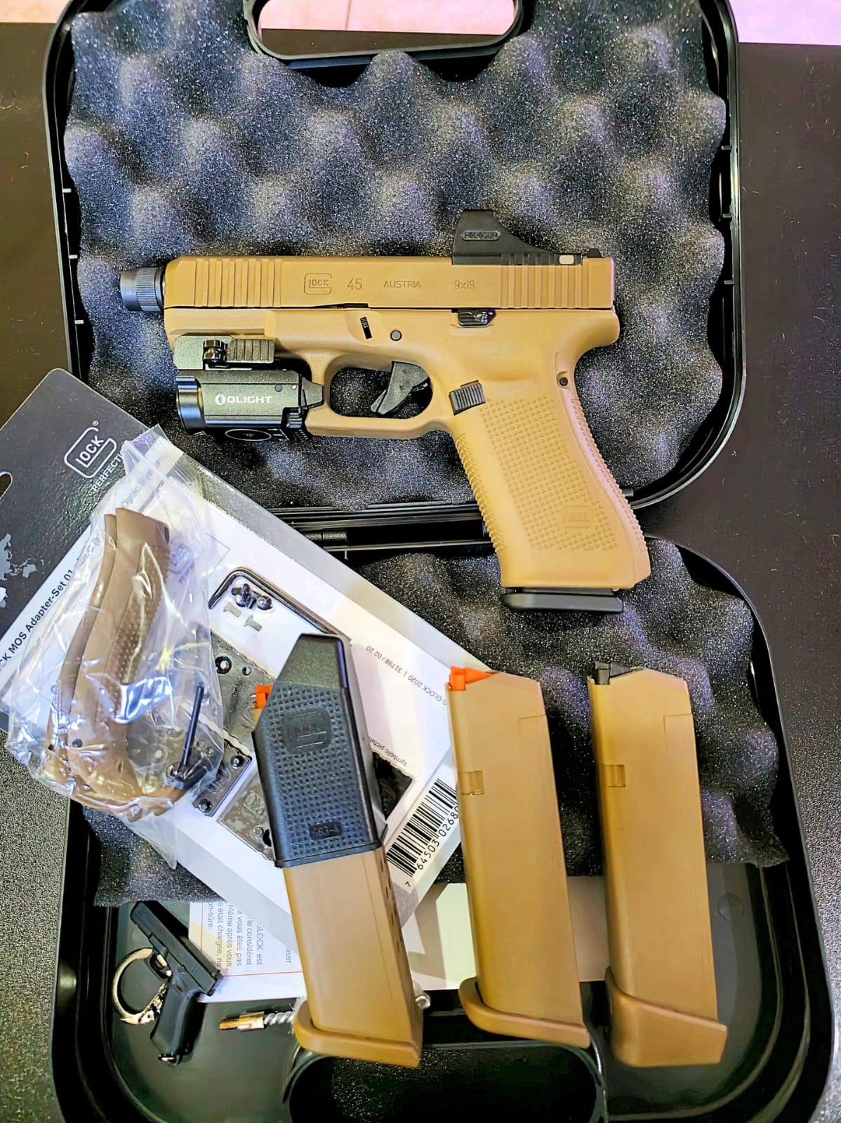כלל הערכה המלאה מזוודה, 2 מחסניות 17, ערכת פלטות לכוונות חדשה ומקורית, הורפנים, חוטר מקורי, מחזיק מפתחות גלוק.